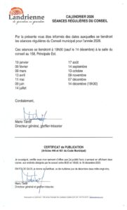 Les séances régulières du Conseil municipal pour l’année 2026 se tiennent à la Salle du conseil municipal au 158, avenue Principale Est aux dates suivantes :