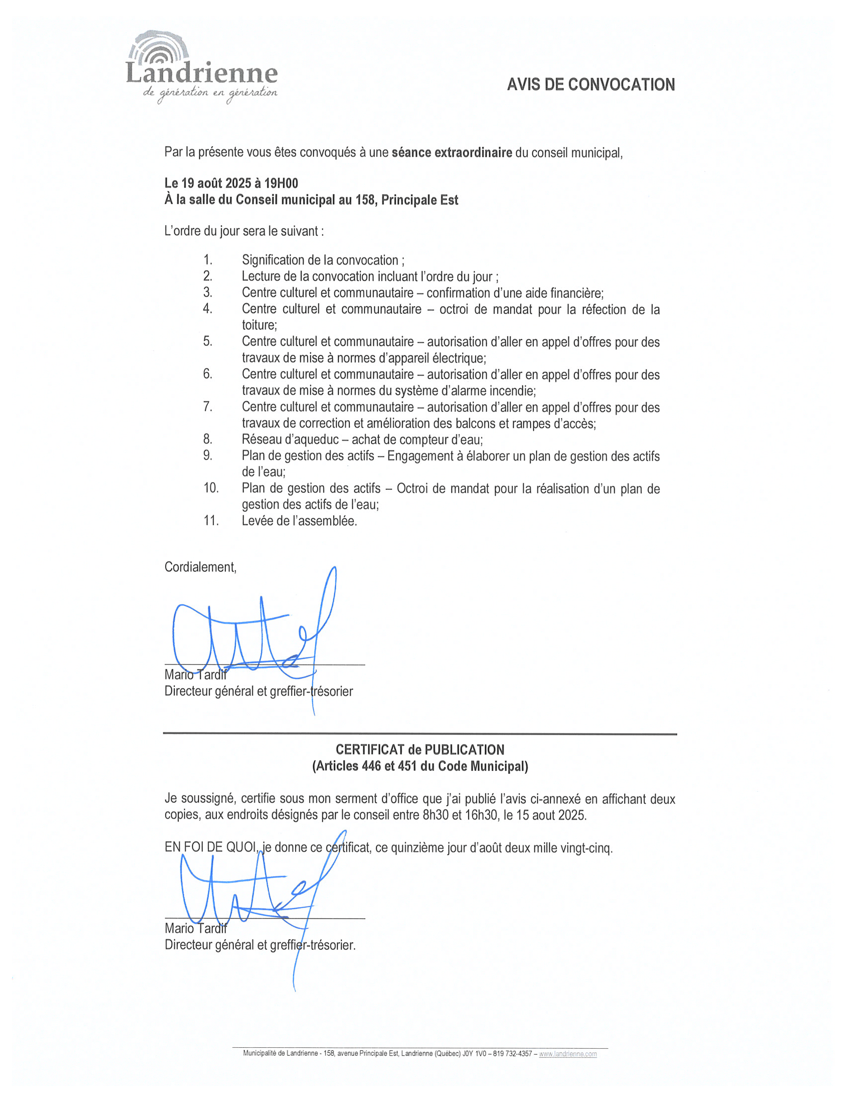 Avis de convocation – Séance extraordinaire du conseil municipal Prev Next Actualité | 15 Août, 2025 | 0 328 Vous êtes convoqués à une séance extraordinaire du Conseil municipal Le 19 août 2025 À 19 H À la salle du Conseil municipale au 158, Principale Est Cliquez ici : Avis de convocation séance extraordinaire Post by Mélissa Blanchette Commentaire(0)